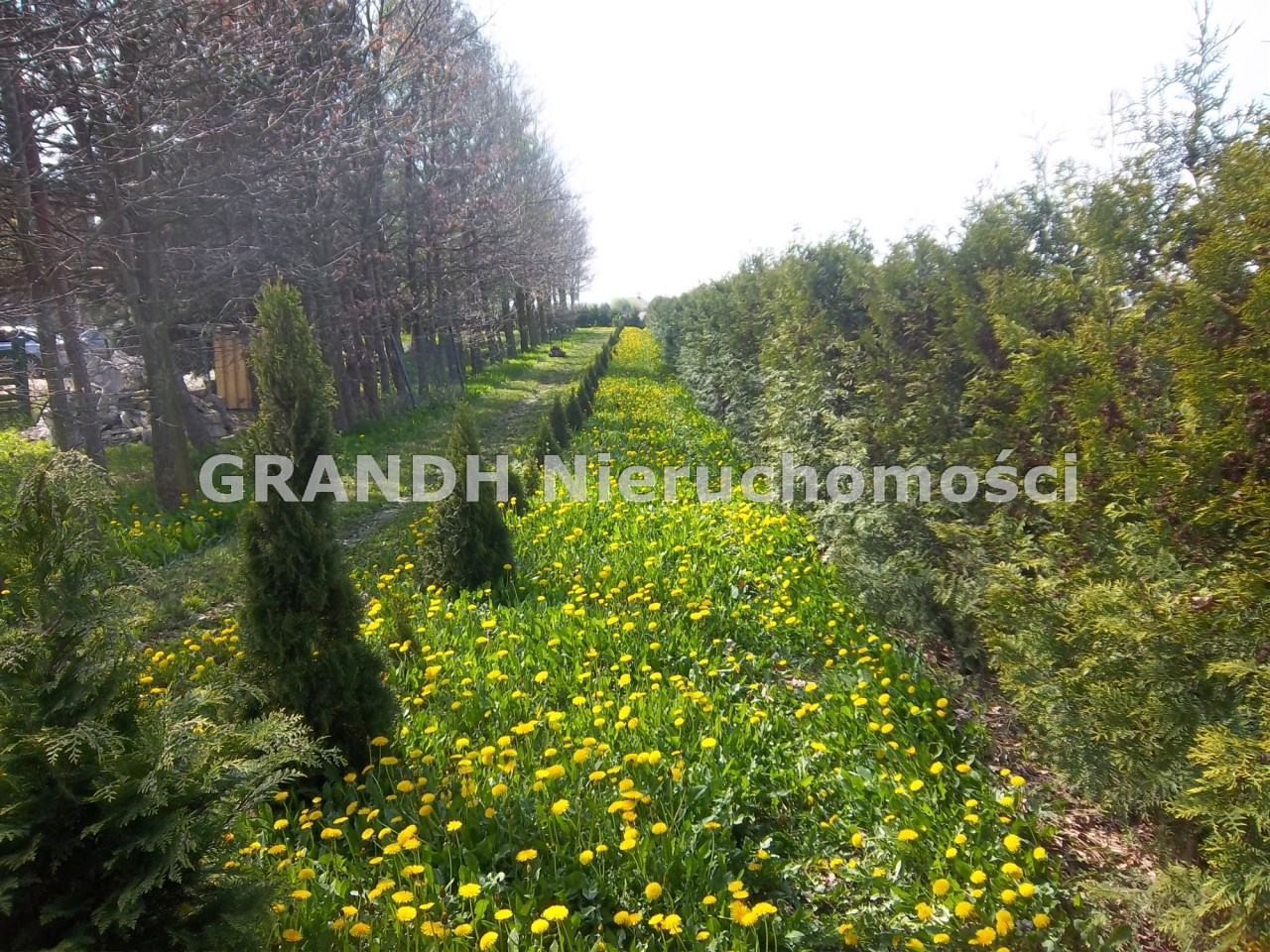 Działka obsadzona drzewami: dęby, sosny, w środku liczne nasadzenia krzewów iglastych.